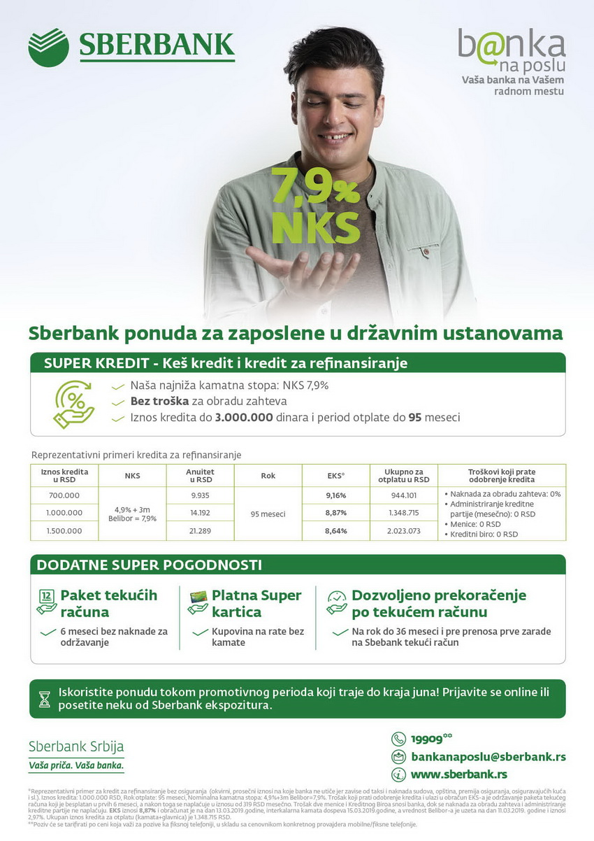 zadovoljstvo nam je da vas obavestimo da je Sberbank za Vas kreirala specijalnu ponudu koja obuhvata: Super kredit - keš i refinansiranje kao i brojne druge pogodnosti koje možete videti u nastavku.