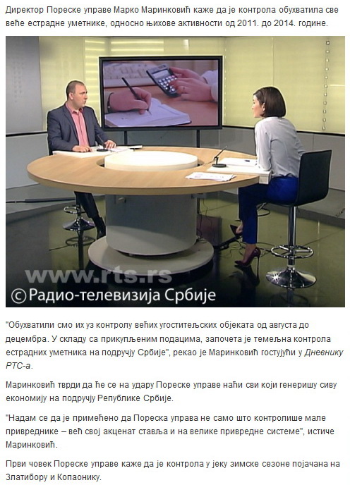Поред богаташа и предузећа који не плаћају порезе и доприносе, на тапету порезника нашла се и естрада. У Пореској управи почела је реформа и промењени су принципи рада те се очекује пунији буџет.