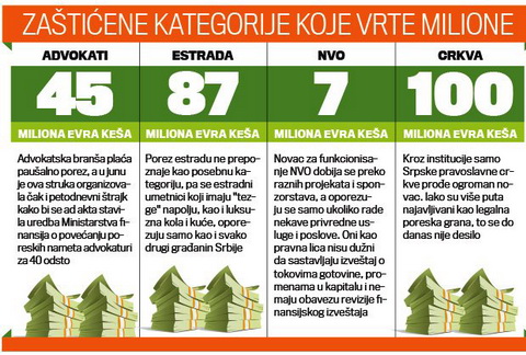 Uprkos zaradama od prosečnih 2.500 evra advokati i dalje državi plaćaju porez paušalno, od 200 do 500 evra mesečno. Procene govore da bi od naplate PDV na advokatske usluge država inkasirala više od 45 miliona evra godišnje, dok bi oporezivanje prihoda NVO, koje samo država donira sa oko 35 miliona evra godišnje, budžetu donelo dodatnih sedam miliona evra. Kurir je već pisao o tome da pevači godišnje utaje oko 87 miliona evra.