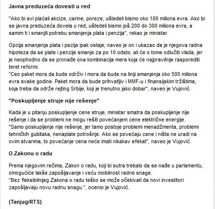U Vladi priznaju da zasad nije razgovarano o formuli po kojoj će se umanjivati zarade veće od 100.000 dinara. Prema aktuelnom planu, i one će biti umanjivane deset odsto.