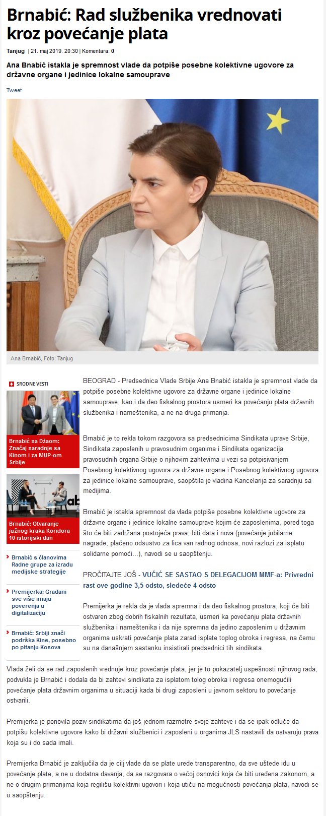 U cilju konačnog usaglašavanja odredbi Posebnog kolektivnog ugovora za državne organe i Posebnog kolektivnog ugovora za lokalne uprave Srbije zakazan je novi sastanak predsednika Sindikata uprave, Sindikata pravosuđa i SOPOS-a sa predsednikom Vlade Republike Srbije – Anom Brnabić i ministrom za finansije Sinišom Malim, dana 21.5.2019. godine sa početkom u 16 časova.