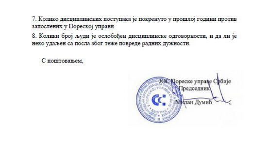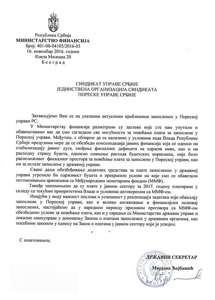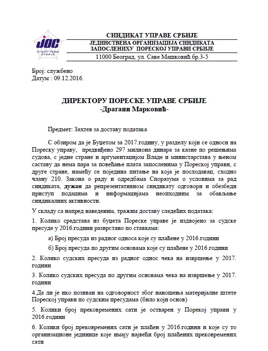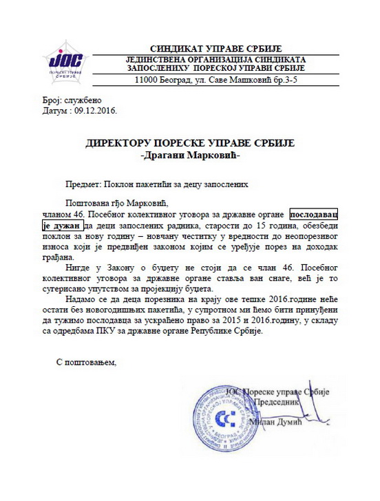 U svakom slučaju, ako niste spremni na iskren i preko potreban dijalog, ovaj Sindikat će biti prinuđen da se obrati lično i premijeru Srbije, jer je naša i želja i obaveza da vidimo šta ova država misli o Poreskoj upravi i zaposlenih koji u njoj vredno rade, da li će joj pomoći da se uzdigne na viši nivo u svakom pogledu, i kadrovski i organizaciono, ili će nastaviti da je i dalje urušava.