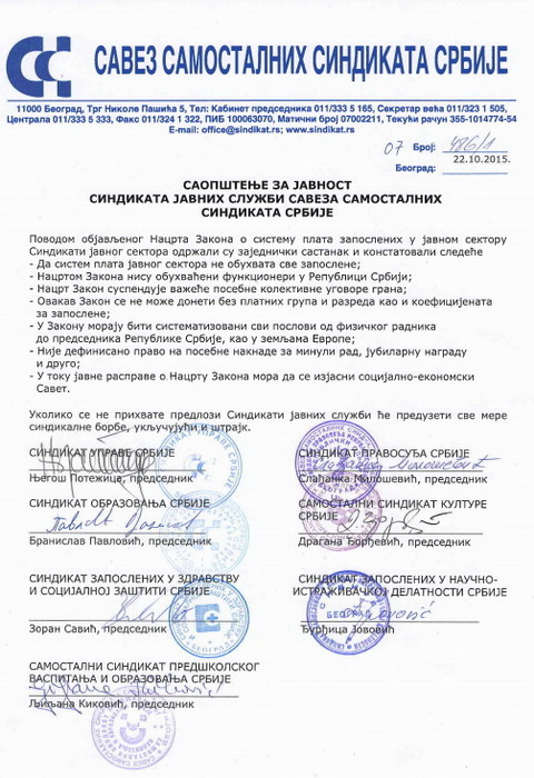 Na zahtev Sindikata uprave Srbije održana je 29.10.2015. godine Javna rasprava na Nacrt Zakona o sistemu plata zaposlenih u javnom sektoru gde je konstatovano: