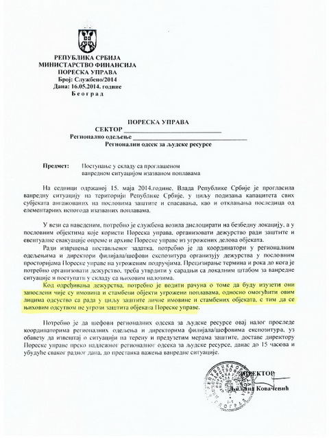 Međutim, Jedinstvena organizacija sindikata zaposlenih u Poreskoj upravi Srbije, s obzirom na razmere prirodne katastrofe koja nas je zadesila, poziva sve zaposlene u Poreskoj upravi da dobrovoljno uplate solidarnu pomoć za postradale u poplavama izdvajanjem sredstava u visini jedne dnevnice po zaposlenom u PU, koja će biti uplaćena na dinarski račun, otvoren od strane Vlade RS, broj 840-3546721-89, svrha uplate: otklanjanje posledica vanrednih okolnosti – poplave.