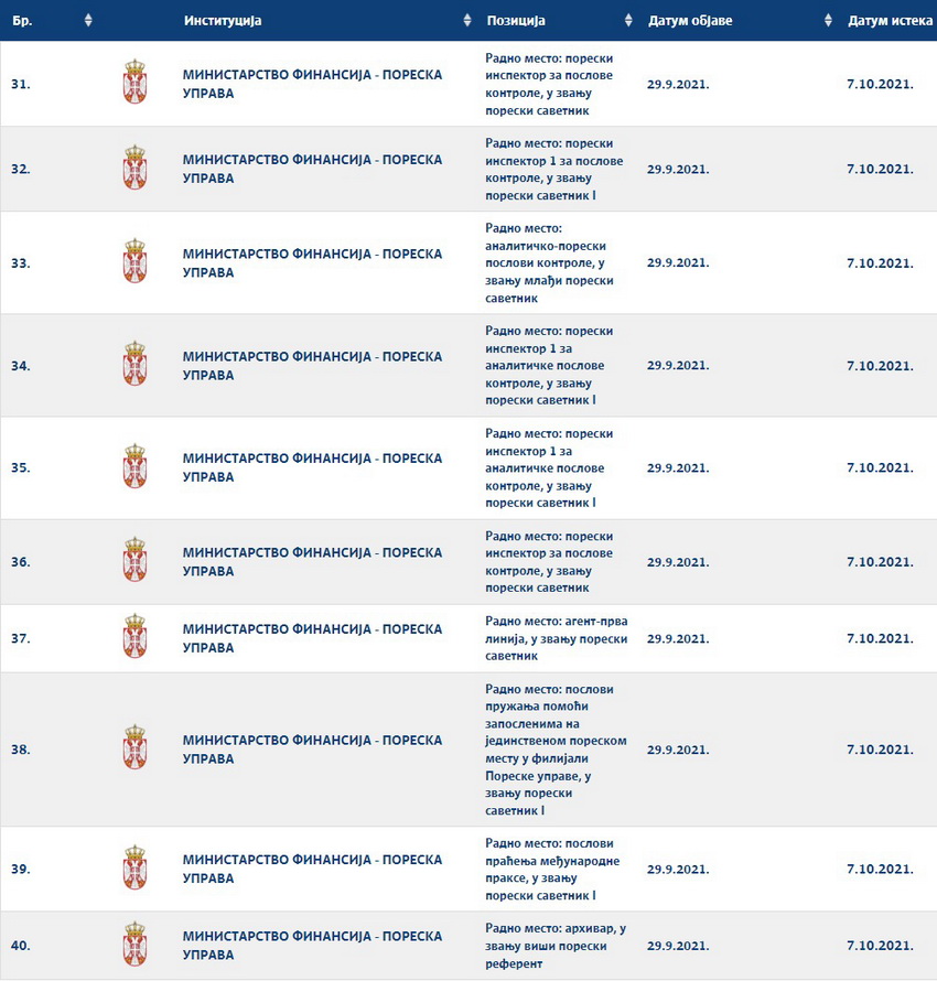 Na osnovu člana 169b Zakona o poreskom postupku i poreskoj administraciji („Sl. glasnik RS“, br. 80/02, 84/02 - ispravka, 23/03 - ispravka, 70/03, 55/04, 61/05, 85/05 - drugi zakon, 62/06-drugi zakon, 61/07, 20/09, 72/09-drugi zakon, 53/10, 101/11, 2/12 - ispravka, 93/12, 47/13, 108/13, 68/14, 105/14, 112/15, 15/16, 108/16, 30/18, 95/18, 86/19, 144/20, 96/21), člana 9 stav 1 Uredbe o internom i javnom konkursu za popunjavanje radnih mesta u državnim organima („Sl. glasnik RS“, br. 2/19, 67/21) i Zaključka Komisije za davanje saglasnosti za novo zapošljavanje i dodatno radno angažovanje kod korisnika javnih sredstava 51 broj: 112-9913/2021 od 27. oktobra 2021. godine, oglašava